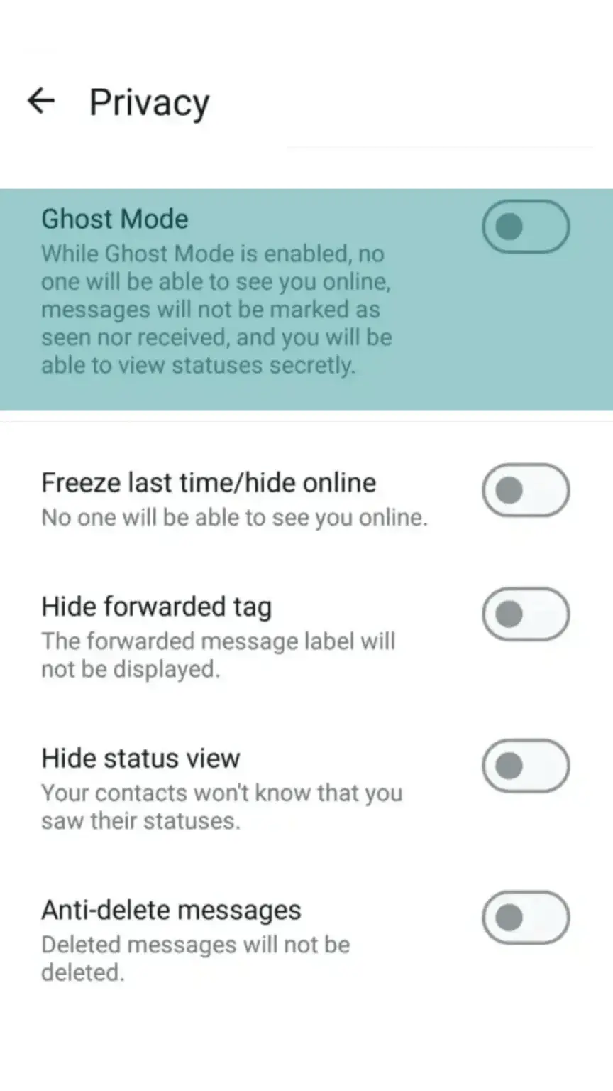 - Enhanced Privacy Controls: Hide last seen, blue ticks, double ticks, and online status for full anonymity.